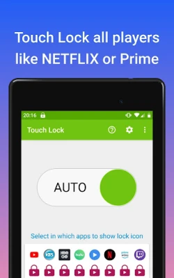 Touch Lock will disable screen touch and hide buttons, while any video player is running. When you or your child watch videos, it locks touchscreen and disables touch for navigational buttons, so you stay locked inside the video streaming service.