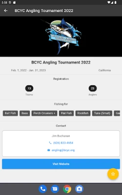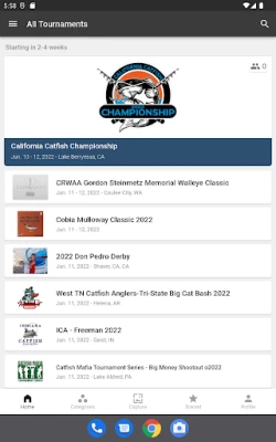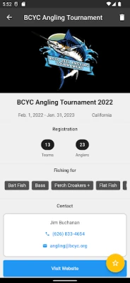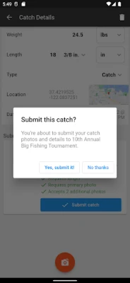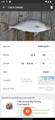Take catch photos both offline and online stamped with location information and ready to submit to tournaments that you're registered to that accept catch submissions.